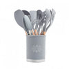 Set ustensile bucatarie, 12 bucati din silicon termorezistent si maner din lemn natural, GRI